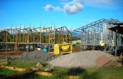 En cette période de fin d’année où nous écrivons, les trois quarts des structures métalliques sont terminées, la moitié de la toiture est posée. Au début de l’année, on posera les plafonds et on coulera la dalle des planchers. Les murs attendent leur tour, mais cela ne saurait tarder : les plaques de fibrociment couleur tuile et gris sont en fabrication, et devraient être prêtes dans quinze jours.