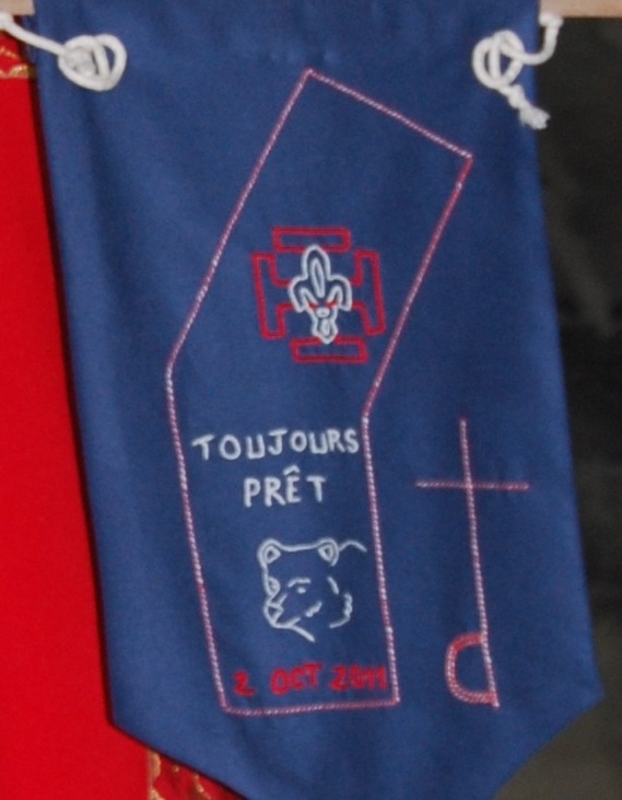 cheminement et l'ordination qui approche elle a confectionnée cette bannière, à la main : - La couleur bleu foncée rappelle mon passage dans la Gendarmerie pendant 24 ans dont 20 ans de secours en PGHM. La Croix scout a été brodée dans ce qui représente l'étole du diacre, "Toujours prêt" pour rappeler cette promesse que j'ai faîte et qui tient toujours ("Sur mon honneur avec la grâce de Dieu je m'engage à servir de mon mieux Dieu, l'Eglise, la patrie...). Une tête non pas d'Ours mais de "Grizzly" du canada puisque mon totem scout est "Grizzly tranquille" (souvenir de la totémisation qui a été assez turbulente pour ceux qui voulaient me lier les mains.. = Force tranquille qui se fait connaître quand il le faut.) Et enfin la date du 2 Octobre 2011 qui marque mon entrée dans le clergé à côté la croix du diacre serviteur...